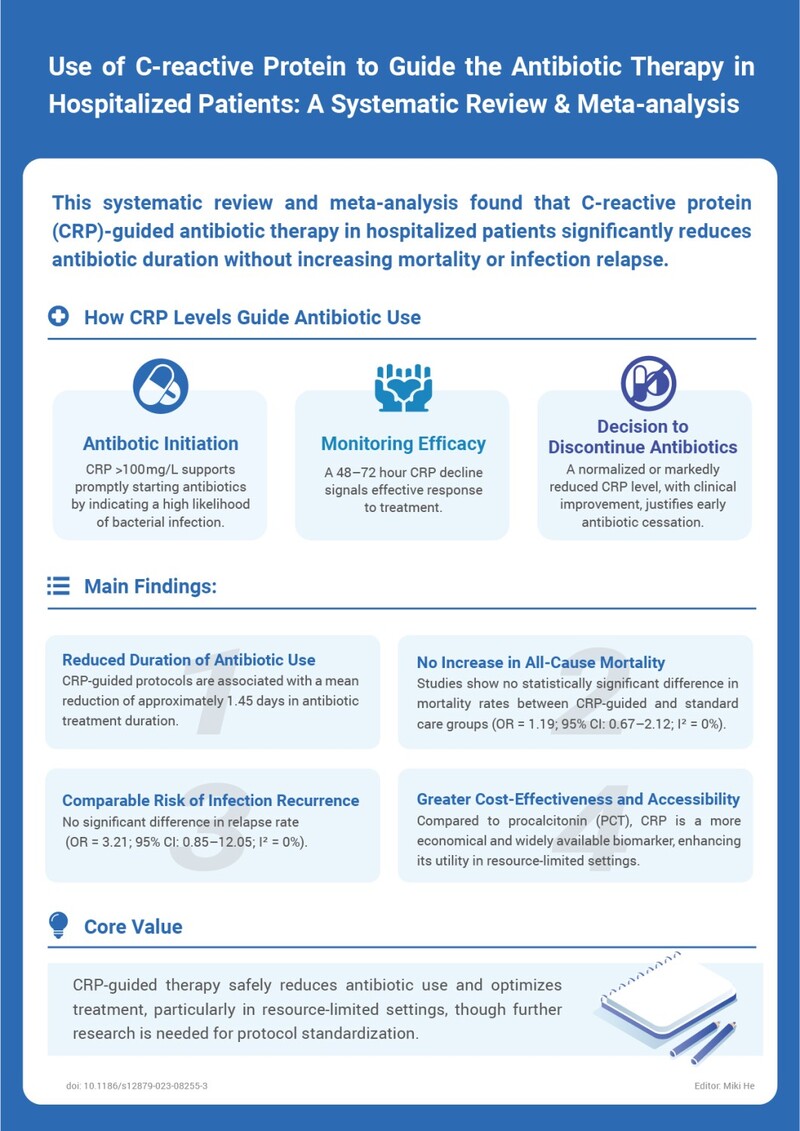 C-reactive protein (CRP) is a widely used inflammatory biomarker that has gained increasing attention for its role in guiding antibiotic therapy in hospitalized patients. A recent systematic review and meta-analysis evaluated the clinical impact of CRP-guided antibiotic strategies and demonstrated that CRP-based decision-making can safely reduce antibiotic exposure without compromising patient outcomes.