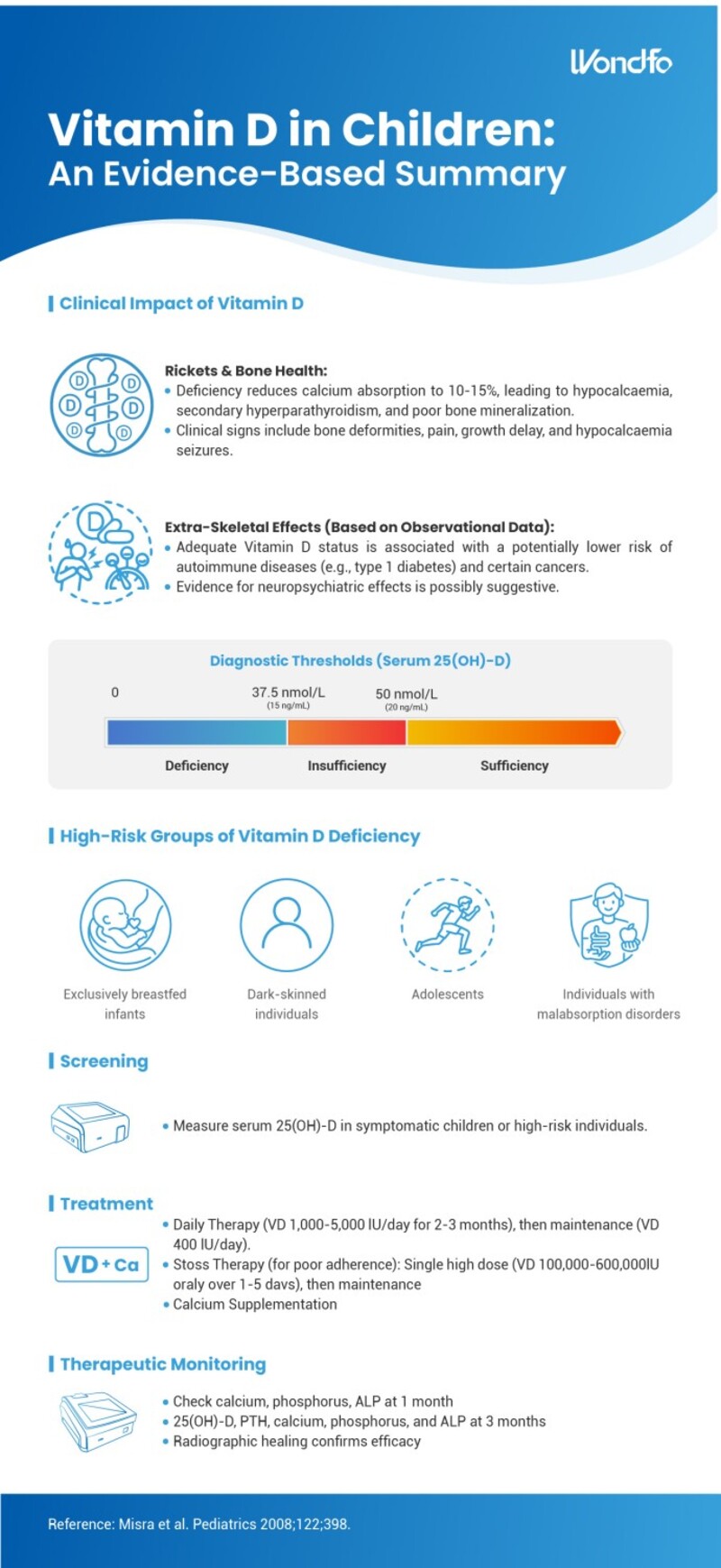 Vitamin D plays a critical role in skeletal development and calcium homeostasis during childhood. Deficiency remains prevalent globally and is associated with rickets, impaired bone mineralization, and potential extra-skeletal health effects. This article summarizes the clinical impact, high-risk populations, screening considerations, and evidence-based management strategies for vitamin D deficiency in children.
